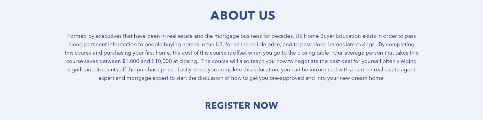Formed by executives that have been in real estate and the mortgage business for decades, US Home Buyer Education exists in order to pass along pertinent information to people buying homes in the US, for an incredible price, and to pass along immediate savings. By completing this course and purchasing your first home, the cost of this course is offset when you go to the closing table. Our average person that takes this course saves between $1,000 and $10,000 at closing. The course will also teach you how to negotiate the best deal for yourself often yielding significant discounts off the purchase price. Lastly, once you complete this education, you can be introduced with a partner real estate agent expert and mortgage expert to start the discussion of how to get you pre-approved and into your new dream home.